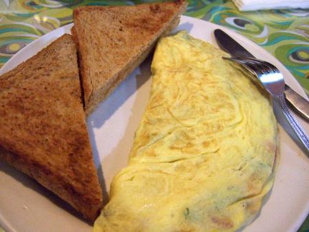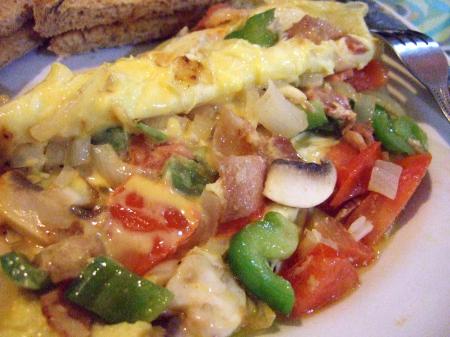 裡面好豐富阿∼有五顏六色的配料哩:蘑菇、綠椒、紅椒、蕃茄、培根、洋蔥、起司,再加上外面微微不熟的蛋皮,超好吃的啦!每一口都很滿足呢∼